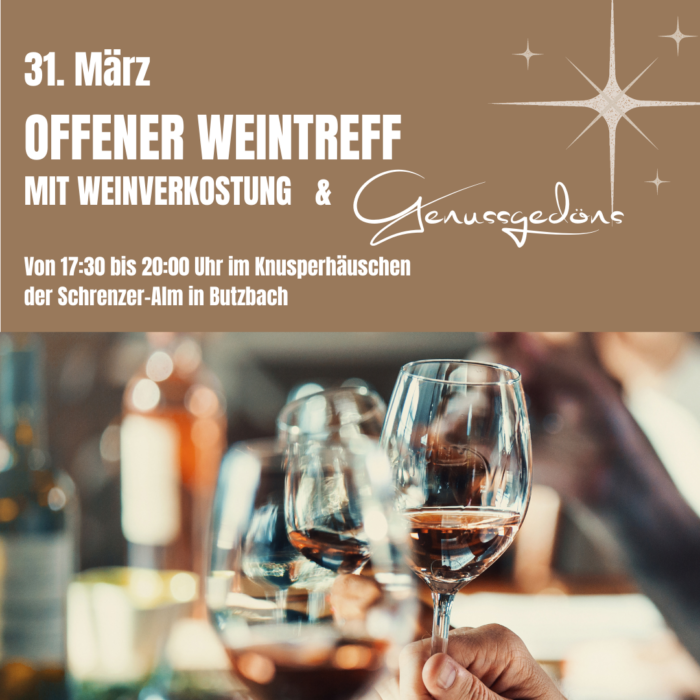 Am 31. März 2023 von 17:30 bis 20:00 Uhr findet in unserem Knusperhäuschen der „1. offener Weintreff“ statt – powered by genussgedöns.de. Einfach vorbeikommen, leckere Weine verkosten, mit Weinfreunden treffen … und neue kennenlernen. Die Weinverkostung kostet 10 EUR p.P. – sonstige Speisen und Getränke entsprechend unserer Schrenzer-Alm Speisekarte.