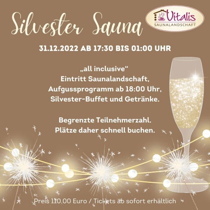 Yippieeeee – was haben wir uns auf diesen Moment gefreut: Es wird dieses Jahr wieder die Silvester Sauna bei uns geben: Am 31.12.2022 ab 17:30 bis 01:00 Uhr erwartet Euch ein „all inclusive“-Abend für nur 110,00 EUR pro Person – dies inkludiert den Eintritt in unsere Saunalandschaft inklusive einem Aufgussprogramm ab 18:00 Uhr und natürlich einem…