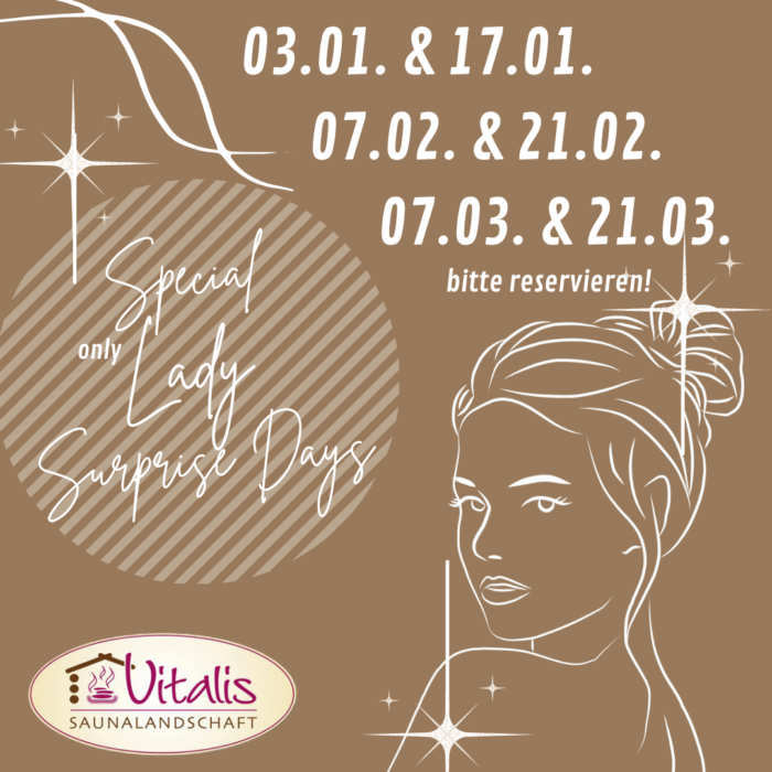 Die Termine für unsere SPECIAL LADY SURPRISE DAYS für das erste Quartal 2023 sind: 07.02.2023 (=bereits ausgebucht, nur noch Warteliste möglich) 21.02.2023 (=bereits ausgebucht, nur noch Warteliste möglich) 07.03.2023 (=bereits ausgebucht, nur noch Warteliste möglich) 21.03.2023 (=bereits ausgebucht, nur noch Warteliste möglich) Es erwarten Euch stündliche Aufgüsse mit reinen ätherischen Ölen, feinem Räucherwerk und Süden…