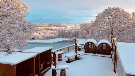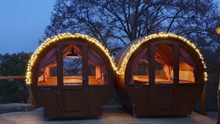 Bis zu acht Leute finden im Fass Platz und die Überdachung schützt vor einem plötzlichen Schauer oder zu viel Sonne.