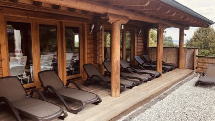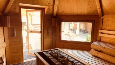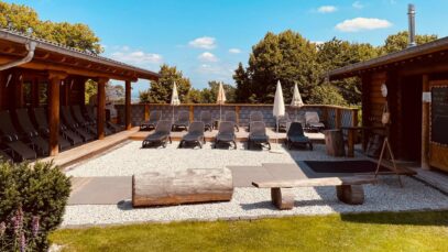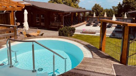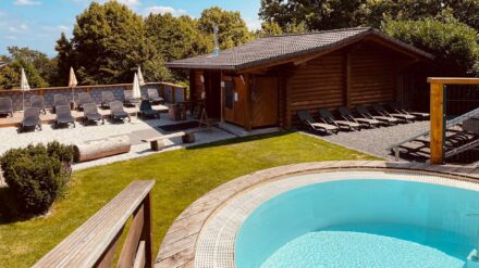Genießt den traumhaften Ausblick in die Wetterau aus unserer Panoramasauna, träumt vor der Feuerstelle in einem der gemütlichen Ruhehäuser, lasst Euch bei einer Massage verwöhnen oder stärkt Euch in unserem Bistro.